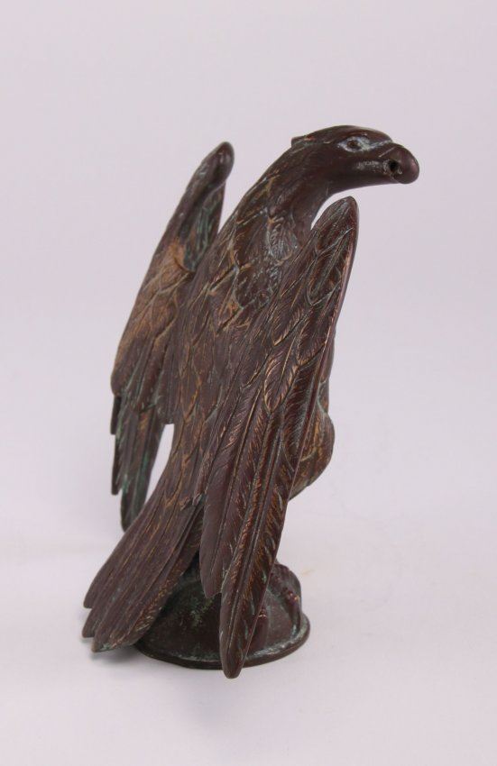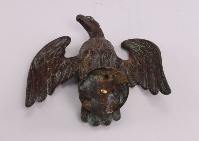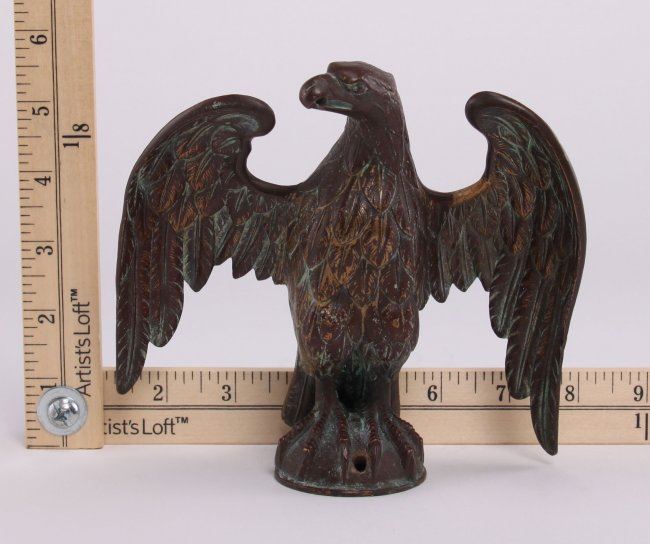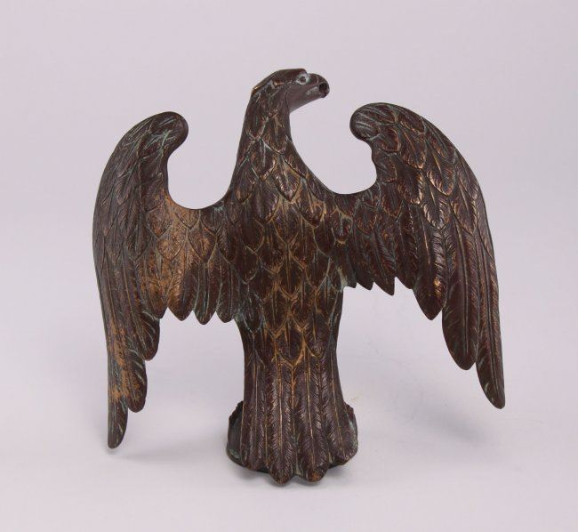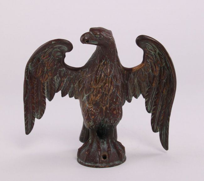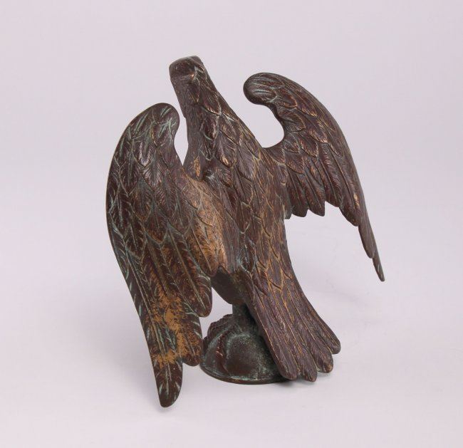 An exceptionally high quality and well preserved Civil War era cast bronze and gilt American eagle flag pole topper, supplied by Tiffany & Co, New York. Gilt wash on cast bronze dated 1862-1865. Provenance: www.rareflags.com , Flag pole toppers are one of the more overlooked areas related to collecting American Flags. Interestingly, the highest quality flag pole toppers are beautiful representations of patriotic Americana on their own. This is an extremely high quality example of cast bronze flag pole topper from the era of the American Civil War. Although the actual foundry that manufactured this eagle is unknown, what is known is that this eagle topper was supplied by Tiffany & Company in New York City. The workmanship of the casting on this particular example is extraordinary even when compared to many others of the same era. Every feather of the eagle is distinct and shows the individual barbs of the feathers. The talons of the eagle are sharp and precisely cast, with the ridges and claws very well defined. Often times, the gilt wash on these flag pole toppers has been lost due to weathering and use, but it remains intact on this example. This topper, on the other hand, appears to have seen very light use, and displays no indications of outdoor weathering. An interesting attribute of the eagle is a hole through the beak of the eagle. Often, a ring could be held in the eagle's beak from which battle streamers would hang on military flags to represent a unit's participation in important battles. Overall, the eagle is a fine example of a little noted but very beautiful type of early Americana from the time of the American Civil War, supplied to the Union Army by one of America's finest and most iconic merchants.