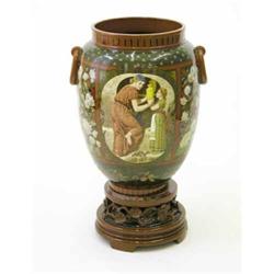 An exhibition quality Minton redware vase, with loop handles on prunus moulded base, painted on each side with large oval panels of a lady at a potters wheel and another removing a vase from the kiln, both assisted by girls, possibly painted by Thomas Kirkby, bordered by white chrysanthemums growing on lattice panels, probably painted by William Heath Pilsbury, impressed mark and date code for 1881, height 32.5ins width 18ins £5,000-7,000