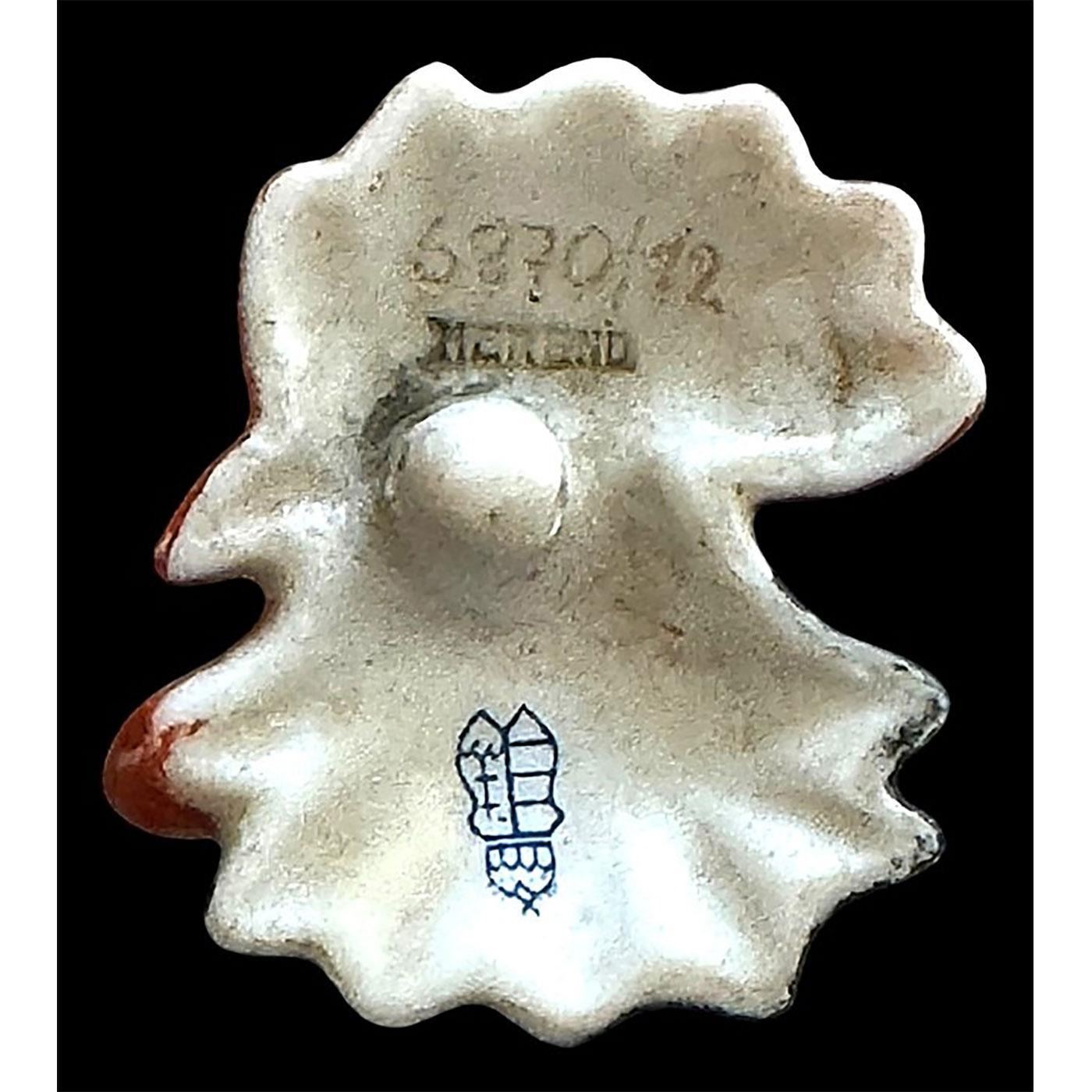 1 Large early 20th C. realistic shaped Herend porcelain button. This is perhaps the rarest button in this auction and actually one of the rarest buttons that exists. The Herend porcelain company in Hungary does not even have records showing that they ever made buttons, and we have been told that the ones like this probably were simply a prototype. Many years ago Bruce received a rare Herend button of a hand with nail polish and a bow. It came to him in a collection and at that time even the best experts had never even seen a Herend button. Herend porcelains have been produced since 1826 in Hungary. This button and the one Bruce owns is not only backmarked with Herend's blue mark but they also have an impressed backmark signifying the Herend company. This colorful rooster head is possibly the only one of its kind just like Bruce's hand example from what we are able to research and determine.