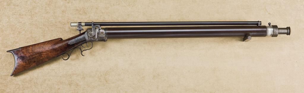 An extremely rare and desirable Colt Target rifle, beautifully Nimschke style engraved, showing Union shields behind hammer and at breech with Germanic scroll extra deluxe engraving covering the lock, hammer, trigger guard and butt plate. The rifle shows an extra deluxe burl walnut stock, extra heavy round barrel; full tube scope marked “Address Samuel Colt, Hartford, Conn.”. The rifle measures nearly 44” overall with approx. 27-1/2” round barrel of extra heavy weight measuring nearly 2” across and in approx. 52 caliber rifled with original bullet starter and semi-false muzzle and removable iron barrel. The gun remains in original near fine condition showing 90%-95% original tobacco brown finish on barrel just starting to tone and thin, action shows case hardened colors gone to silvery grey and brown; very good + stock with some storage dings and mars but shows most of its original varnish and beautiful burl wood grain. The bore is fine to excellent and the rifle shows very little evidence of firing or use. The double set triggers are working and the rifle is very good + to near fine overall. Colt Target rifles are among the rarest of all Colt or American arms with an estimate of 25 produced, probably for the Colt Factory Shooting Team. This is the most deluxe specimen known and was formerly in the premier Colt Collection of Frank Singer which was auctioned by Little John’s on May 7, 1996. At one time there was a 5 page letter of documentation by noted Colt expert R.L. Wilson accompanying this rifle and also appraising this as the best known specimen at the time however this letter was lost in the estate of the consignor and not currently available. From the Richard Wolfe estate. Est.: $15,000-$30,000.