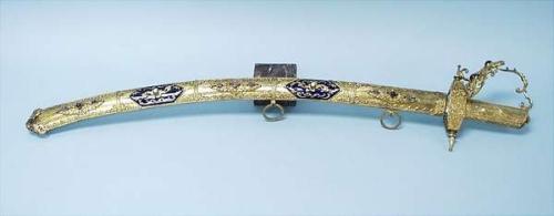 An important Austro-Hungarian pearl and amethyst inlaid gilt silver cavalry officer's saber. The curved steel blade with scroll and pierce work decorated handle and basket handguard. The vermeil scabbard decorated with blue enamel medallions inlaid with pearl and cabochon amethysts. 36" long. Mint condition. 5000-6000