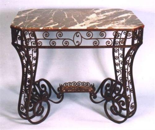 An important French wrought iron salon table. Rectangular form with canted corners, scroll form legs connected with pierce work stretcher. Top with veined grey marble inset. 35" long, 23 1/2" wide, 30" high. Circa 1900. 5000-7000