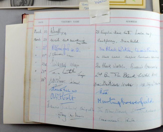 An important Scottish archive of signatures collated together into City and Royal Burgh of Perth The Lord Provost's Visitors Book, dating from 1945-51, including Royals, Dignitaries, Miltary Personel, Politicians, singers & actors including Elizabeth II, Queen Elizabeth The Queen Mother, Princess Margaret, Earl Wavell, Bernard Montgomery, 1st Viscount Montgomery of Alamein, 51st (Highland) Division Notable commanders Victor Fortune, Neil Ritchie, Douglas Wimberley, Winston Churchill, Danny Kaye, Anna Neagle, Greer Garson & many others, over 950 signatures in total & a scapbook containing Telegrams, letters & photographs Provenance: Consigned by the family of Lord Provost John Ure Primrose, during our research we have matched the video from the Scottish Archives when Provost presents Churchill with the Freedom of Perth on 27th May 1948, these dates match the visitors book. http://ssa.nls.uk/film/0841?search_term=provost&search_fields=Film.*&search_join_type=AND&search_fuzzy=yes