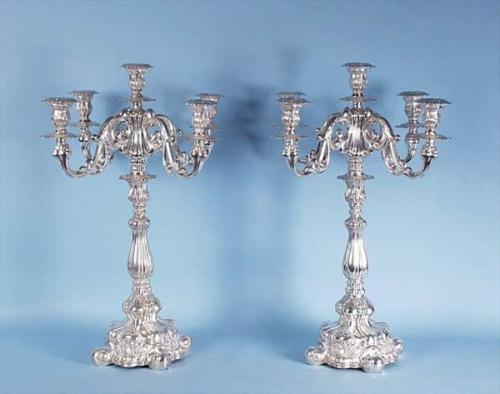 An important pair of Eastern European sterling silver 5 branch candelabra. The ribbed central column raised on a repousse decorated circular base, fitted with four scroll armed candle holders. 26" high. Approx. weight 188 ounces. Marked. 8000-10000