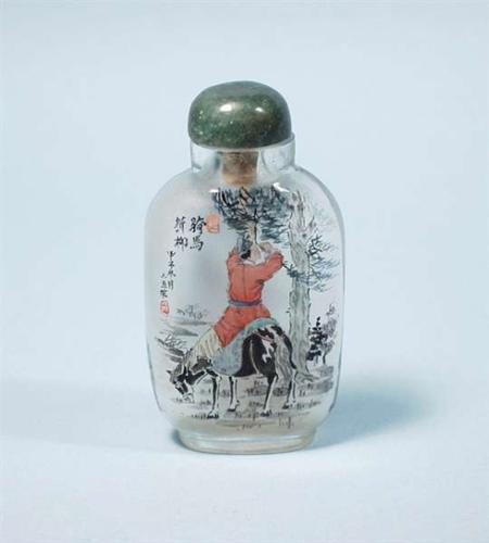 An inside painted snuff bottle decorated with the figure of a peasant and his horse, figures on reverse. 300-400