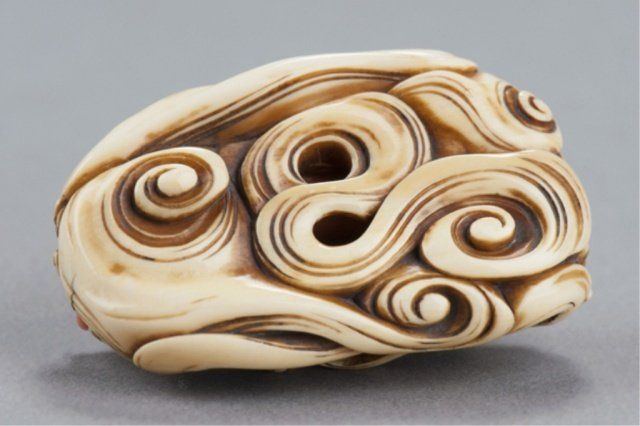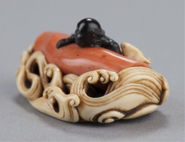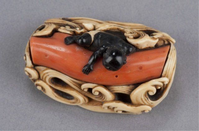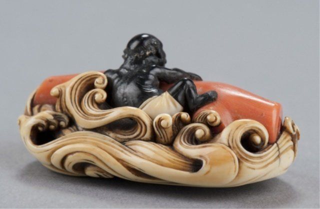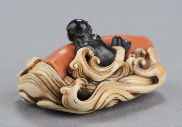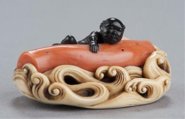 Mid 19th century. Diver in ebony climbing onto a huge piece of natural coral as it floats among high waves of ivory, his loincloth inlaid with ivory. Unsigned. 2in (5cm). Provenance: Sotheby's, London, December 20, 2967; Lot 371.