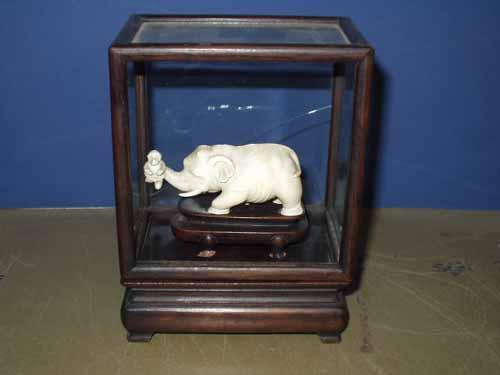 An ivory carving of an elephant and monkey in hardwood case (a.f.), H 17.5cm (case) £40-60