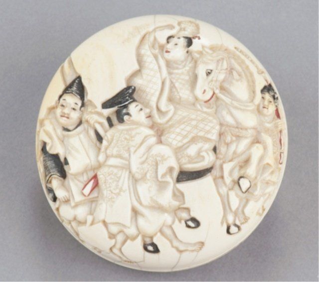 Attributed to Kitaro Hakuunsai III, Tokyo, Mid 19th century. , Mid 19th century. Nobleman on horseback and three attendants who walk beside him, one of whom carries a long sword in a scabbard over his shoulder. The reverse shows a noblewoman, seated with flowing kimono, who raises a club-like instrument with her right hand while her left rolls an obi around a mounted shaft. The hair and caps of all figures front and back are dyed black while the lips and appropriate details of all are done in bright red. Signed on the side, Hakuunsai. 3in (7.5cm). Provenance: Purchased at Parke-Bernet, New York, February 7, 1951.