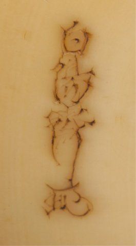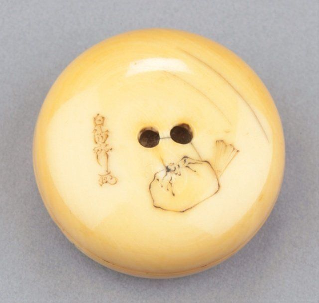 Attributed to Kogyoku Hakuyosai, Tokyo, Mid 19th century. , Mid 19th century. Seated with his monkey. Signed on the reverse along with a package tied up with a furoshiki and is well-worn as is the obverse. The MCI names three artists named Hakuyosai, all using the same kakihan. The 1st (D0519) is supposedly unique, the 2nd is Hakuyosai Kogyoku (D1192), and the 3rd is Hakuyosai Shoraku (D2499). Based on the signatures of the two pieces illustrated in the MCI, this would appear to be the 2nd artist, Kogyoku (D1192), based on what could be called the "bow-legged" sai character. None of the signatures shown in the MCI or in Lazarnick are as exaggerated or distinct as on this piece. 1 3/4in (4.6cm).
