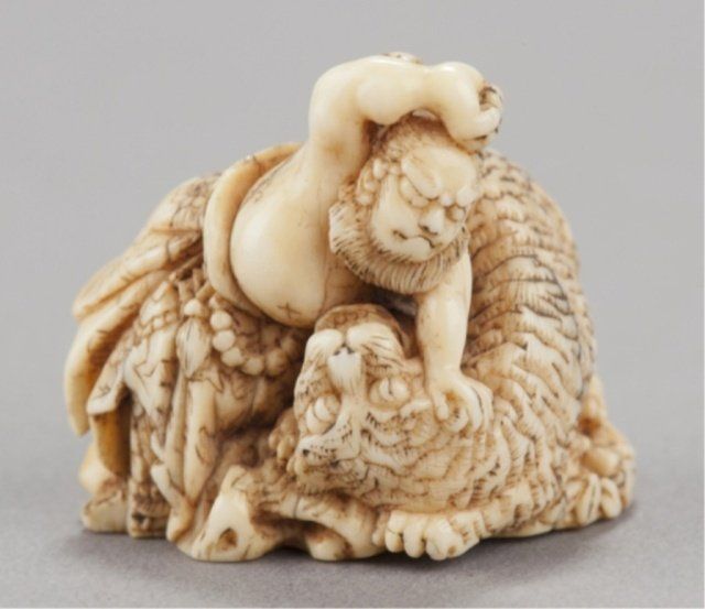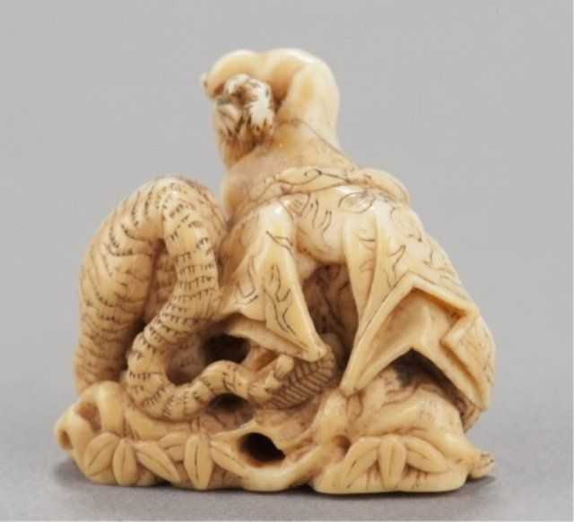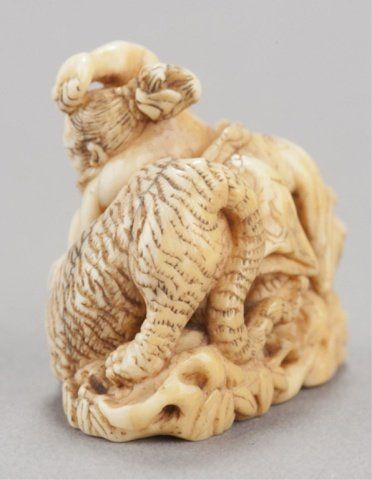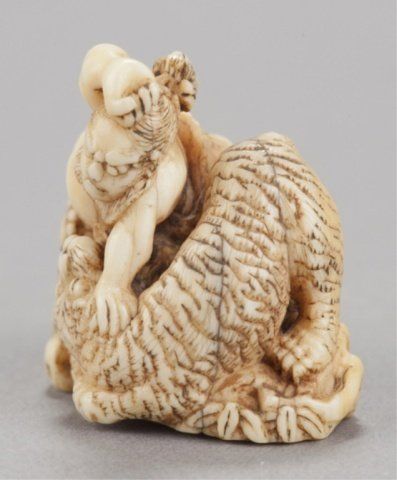 By Chikuyosai Tomochika 1st, Tokyo, Early 19th century. , Early 19th century. Holding the struggling tiger with one hand, his other with clenched fist raised, the tiger's stripes are so deeply carved that they appear to be in relief, some wear and age cracks, with an old chip to the right foot of Busho. Signed in wavy reserve, Tomochika. 1 1/4in (3.3cm). Provenance: Ex M.T. Hindson collection, Sotheby's, London, July 9, 1968; Lot 599. Illustrated in Davey, Fig. 419. Ex H. L. Joly collection (Illustrated in his Legends, page 368). Ex Guest collection, No. 775.
