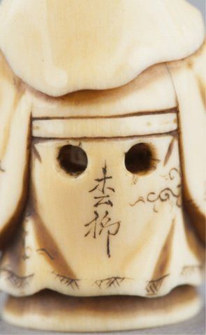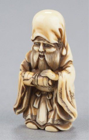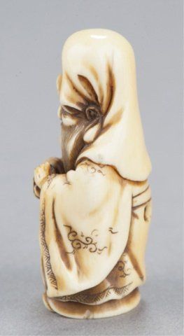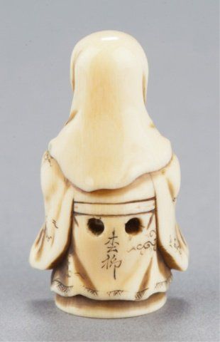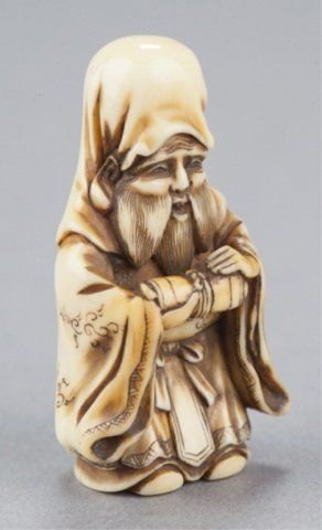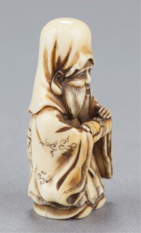 By Shoryu. Tokyo - Asakusa, Mid 19th century. standing and holding a scroll with both hands. Signed on back, Shoryu. 1 3/4in (4.4cm). Provenance: Illustrated in Lazarnick page 976. Illustrated in MCI page 754. Purchased from R. Koscherak, 1954. Ex Thacher Clarke collection.