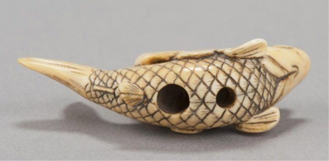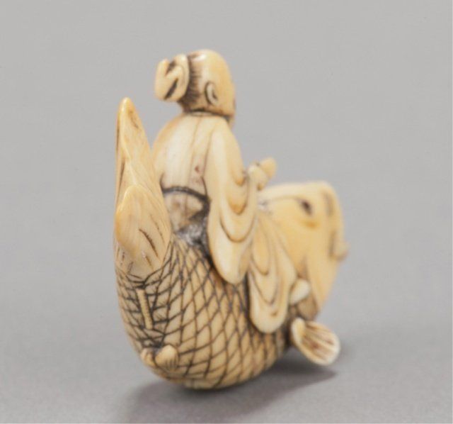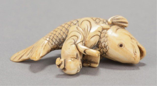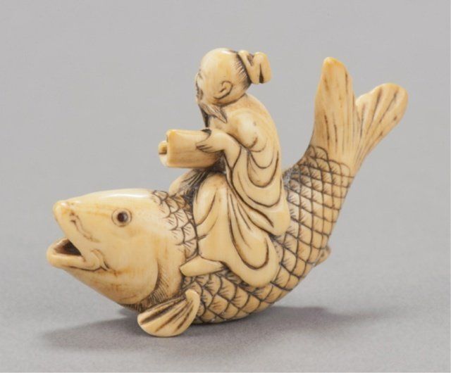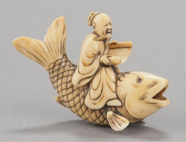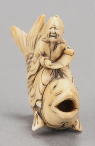 Late 18th century. Riding a giant Carp while reading a scroll, the eyes of the fish inlaid in horn and its mouth wide open, the scales are well rendered, and Kinko's face and beard are nicely detailed, the ivory of good color and patina, the himotoshi are very large and of unequal size. Unsigned. A similar model shown in Davey, figure 1019, that was in the Hindson, Sharpe, Guest, Trower Lucas, and Weber collections and illustrated in Joly's Legends.2 3/8in (6.1cm). Provenance: Sotheby's, New York.