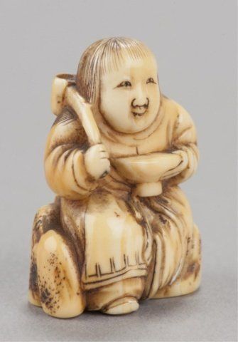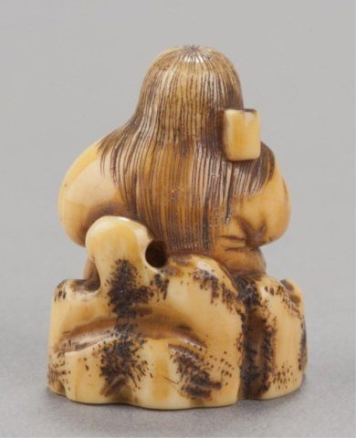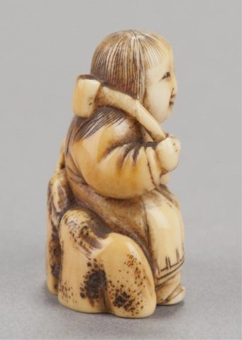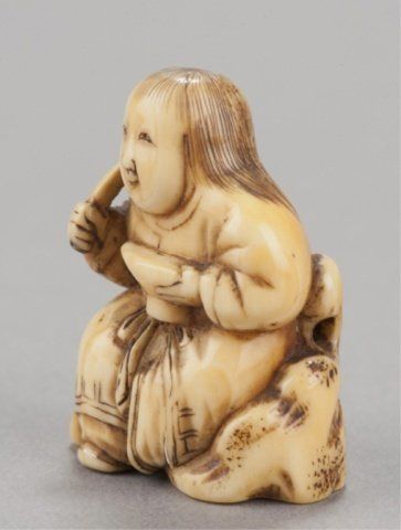 Mid 19th century. Seated on a rock with a long handled dipper held over the right shoulder and holding a bowl of sake with the left hand. The piece is nicely worn and it has been suggested, in the style of Homin. Possibly walrus ivory. Unsigned. 1 5/8in (4cm).