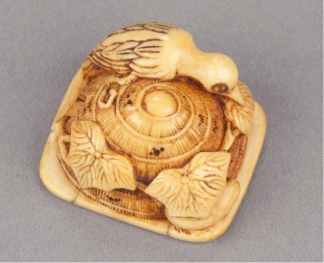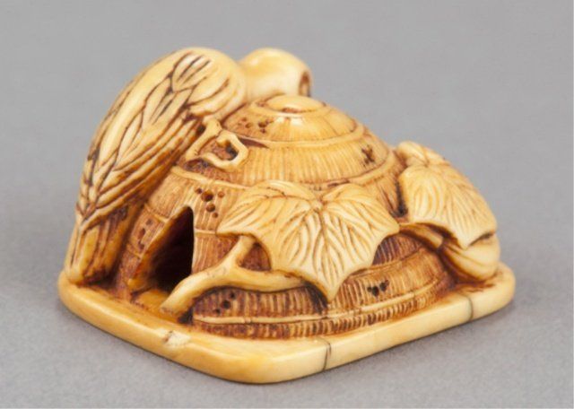 Asakusa school, Tokyo - Asakusa, Mid 19th century. Sitting on a straw hat surmounted by a squash vine and leaves, the hat has been pierced with holes to simulate decay, the base is smoothly polished with a single himotoshi in the center that exits from a large cavity on the back of the hat. The hat has been finished with an orange stain, the rest with some wear and patination and a couple of age cracks on the bottom. Unsigned. Attributed to Rensai. 6/8in (2cm).