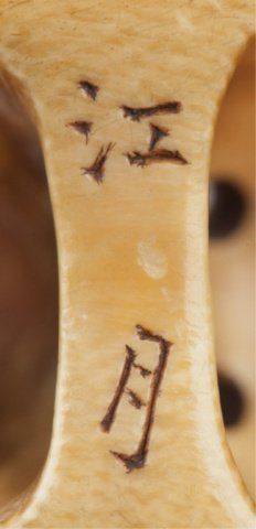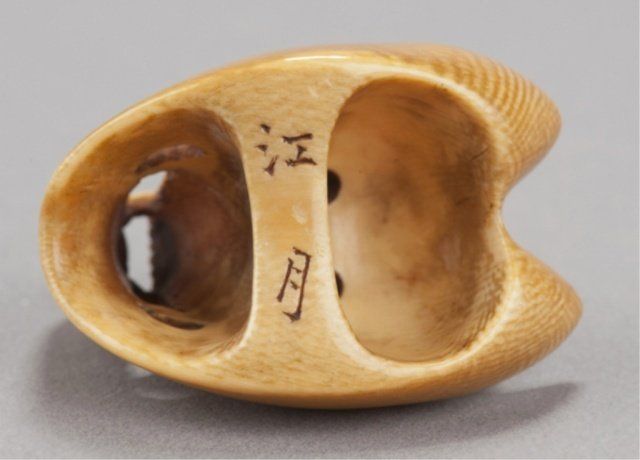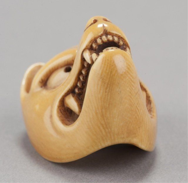 By Kogyoku, Nagoya, Mid 19th century. The mouth open with teeth clenched and the pupils cut entirely through, nicely stained. Inscribed on the crossbar, Kogyoku. While the signature uses the same characters as the well-known follower of Bazan, may be a different artist as this work appears to be a little later and the Getsu character is formed using both horizontal strokes whereas most examples show the D1180 carver using only a single horizontal stroke. 1 7/8in (4.7cm). Provenance: Purchased from R. Koscherak, 1954.