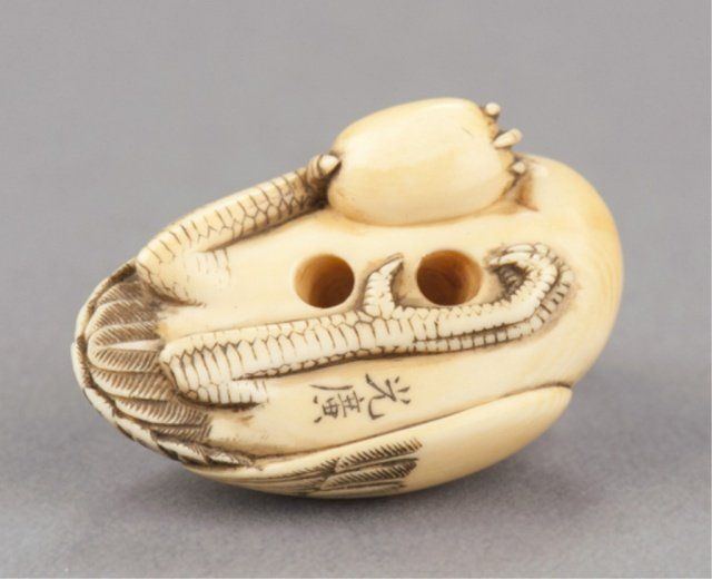By Ohara Mitsuhiro (b.1810), Osaka, , Mid 19th century. At rest with one claw holding its egg while the other appears to grasp one himotoshi on the underside. Signed on the underside without reserve, Mitsuhiro. Ex Richards collection. 1in (2.6cm). Provenance: Ex Richards collection. Purchased from R. Koscherak, 1957.