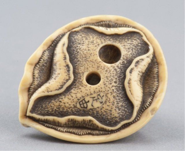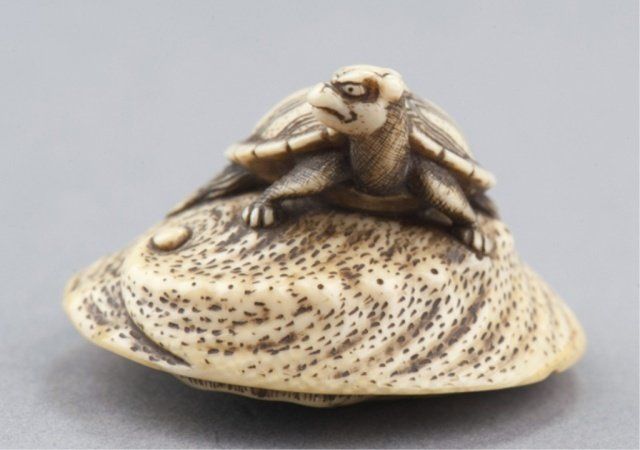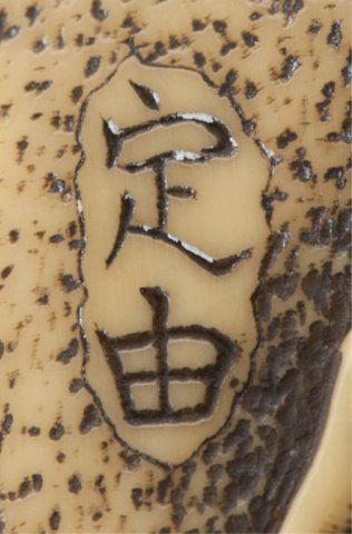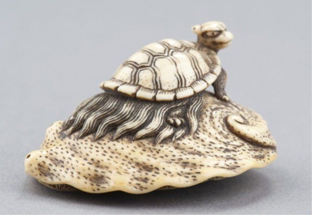 By Sadayoshi, Osaka, , 19th century. Sitting atop an awabi shell trailing his finely rendered hair while the underside of the bivalve is realistically portrayed. Signed in a typical wavy lined torpedo shaped reserve, Sadayoshi. Similar to the piece shown by Lazarnick on page 906 1 1/8in (2.7cm). Exhibited: Delgado Museum, New Orleans, LA (March-April, 1960)