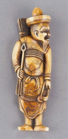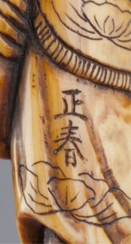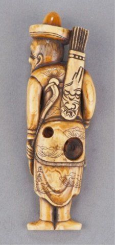 By Masaharu. 19th century. Standing and holding a bow in his left hand and a large arrow in his right. He wears a Tartar hat and his mouth is open, his robe is finely engraved with lotus designs, the quiver slung from his back with a T'ao T'ieh. Signed at the lower left, Masaharu. 3 7/8in (9.9cm). Provenance: Purchased at auction at Hauswedell, Hamburg, Germany, May 20, 1963.