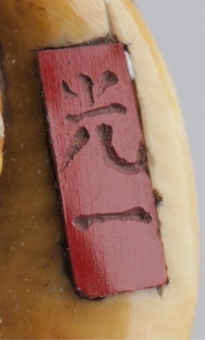 By Koichi, Tokyo, Late 19th century. The lower jaw of the mask suspended by two cords while the back is more graceful with large himotoshi and more nicely stained. Signed on an inlaid rectangular tsuishu lacquer plaque, Koichi. 2 1/8in (5.6cm). Provenance: Ex Richards collection. Purchased from R. Koscherak, 1957.