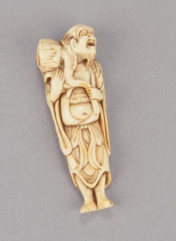Late 18th century Holding a large lotus stem and Pod to his right shoulder, inside of which sits a replica of his Spirit, lightly worn with a good patina on the back, good himotoshi. Unsigned. 3 1/2in (9cm).