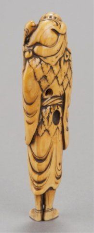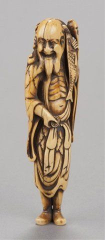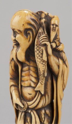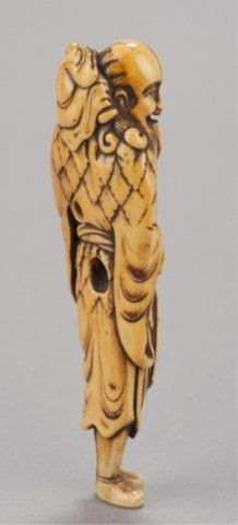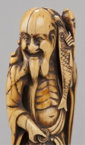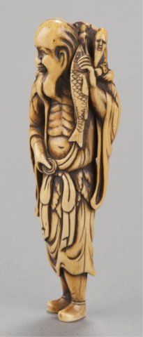 Mid 18th century. Standing and holding a fish aloft with his left hand while his spirit rests on his left shoulder, richly patinated with large himotoshi on the back. Unsigned. 5 1/8in (13cm). Provenance: Purchased in Tokyo, 1951.