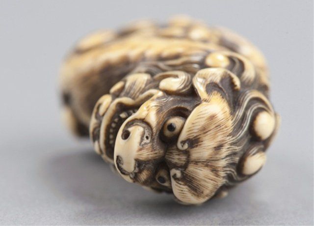 Kyoto, , Late 18th century. Roaring figure grasping a ball.. Eyes inlaid in dark horn. Signed on underside in an oval reserve, Mitsuharu. 1 7/8in (4.6cm).