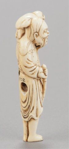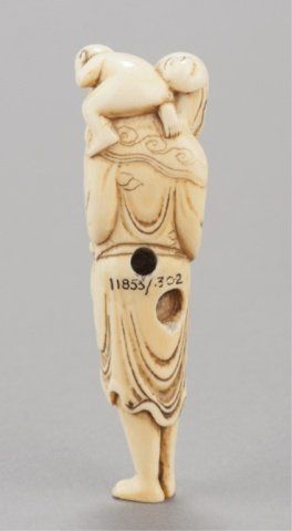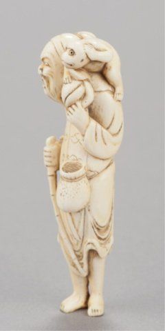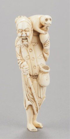 Kyoto School. Kyoto, Late 18th century. , Late 18th century. The bearded old man stands holding a bamboo guide stick in his right hand, his left supports a large peach while the monkey sits atop his left shoulder. Unsigned. Collection number in black on back, 11853/302. 3 7/8in (10cm).
