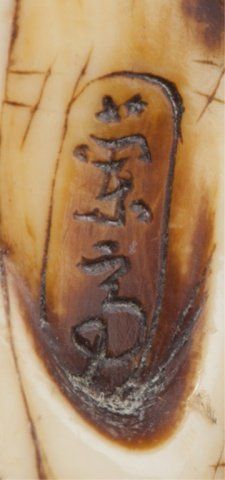 Nagai Rantei, Kyoto, , Mid 19th century. In the guise of a waiter in the process of transformation, in his right hand he holds a tablet with the single character, Kayoi(order book). The eyes are inlaid in black horn, and a long un-human tongue hangs out of his mouth and his tail protrudes from under his robe. Signed on the right rear of his robe in a polished oval reserve, Rantei. 2 5/8in (6.6cm). Provenance: Purchased from Sydney L. Moss, Ltd, London, 1982.