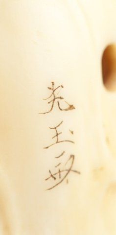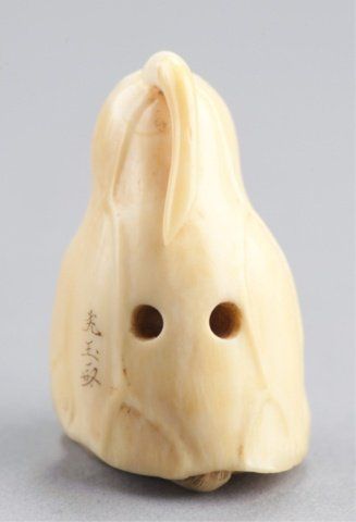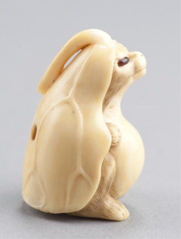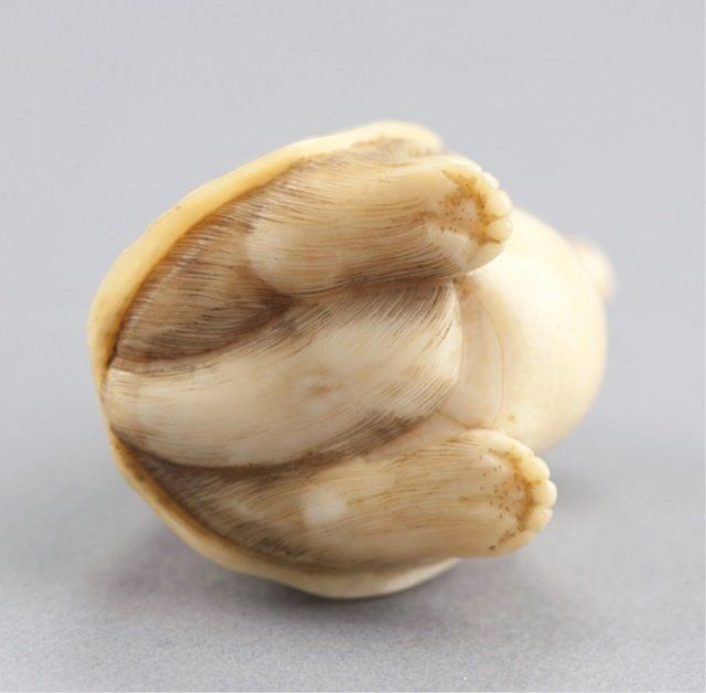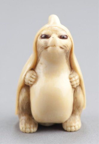By Kogyokusai, Tokyo, Mid 19th century. , Mid 19th century. Using a lotus leaf as a cloak, the veins on the lotus leaf are raised and the eyes are inlaid in amber colored horn with black pupils. Signed on the back, Kogyokusai. A nearly identical model is in the British Museum (F.493. Franks Collection) and is illustrated as Figure 120 in Barker & Smith's book on Netsuke. 1 3/4in (4.5cm).