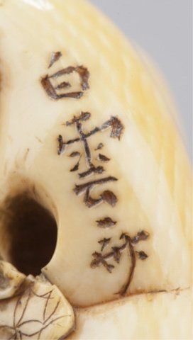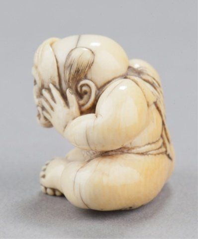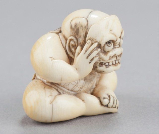 Attributed to Ichijo Hakuunsai II, Tokyo, Mid 19th century. , Mid 19th century. The muscular boy sitting cross-legged wearing a loin-cloth and holding a large Buaku type mask over his face, the ribbons that secure the mask are knotted and cascade down his bare back. Signed on the underside, Hakuunsai. 1 1/8in (2.8cm). Provenance: Purchased from Sydney L. Moss, Ltd, London, 1982.