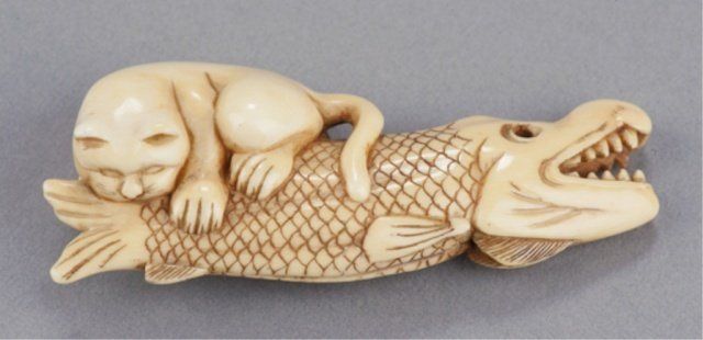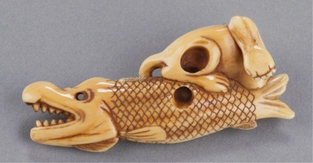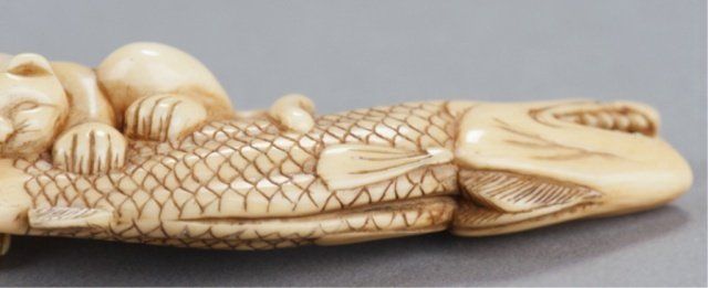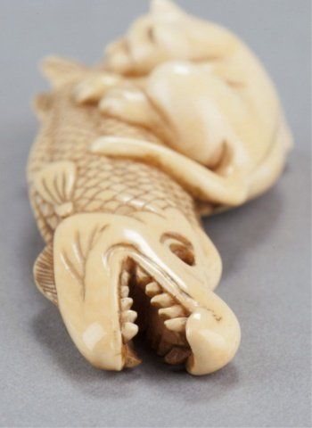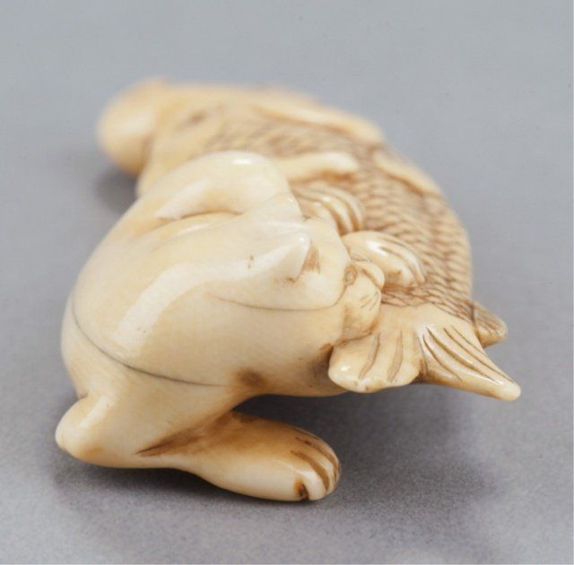 Mid 19th century. Partially astride a dried Carp, the tail of which he has firmly in his mouth, the ivory of good color and well patinated on the bottom where there are good himotoshi of unequal size. Unsigned. 2 7/8in (7.5cm). Provenance: Ex Richards collection. Purchased from R. Koscherak, 1957.