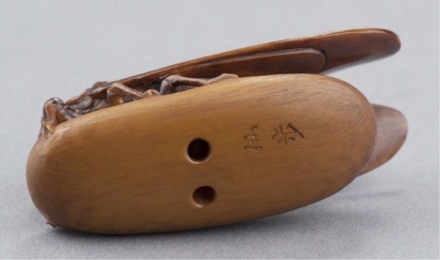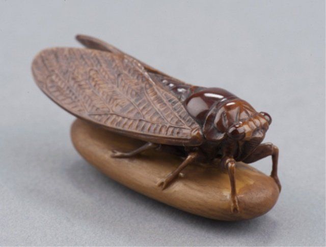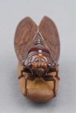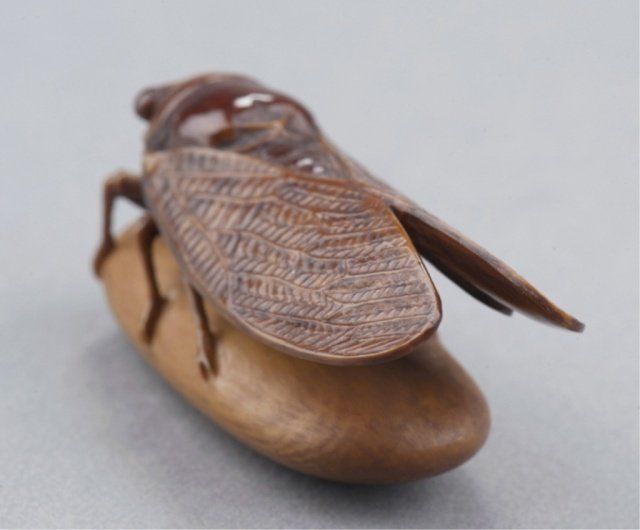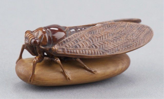 By Senpo, Tokyo, c.1953. Perched on a rounded section of wood, the ivory base stained a light tan simulating the wood, the cicada stained two shades of brown, darker for the thorax and eyes, lighter for the well-veined wings. Signed without reserve, Senpo. 2 1/8in (5.4cm).