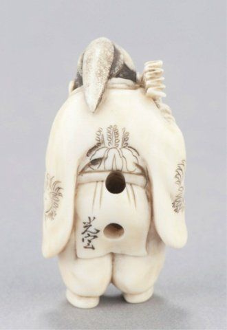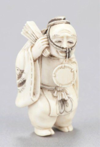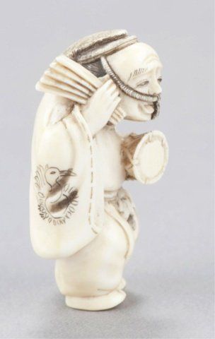 Student of Mitsusada, Osaka, , Late 19th century. Holding a tzuzumi drum in his left hand and a folded fan in his right and his heavily stippled cap is held on to the back of his head by a strap that passes under his nose. His robe is etched with designs of birds on the sleeves and flowers on the back. All of the designs are reinforced with black ink. Signed on the back without reserve, Mitsusada. 1 3/4in (4.4cm).