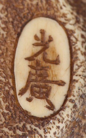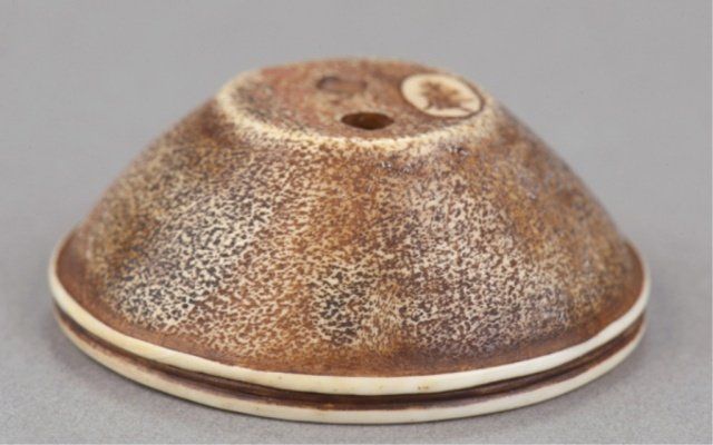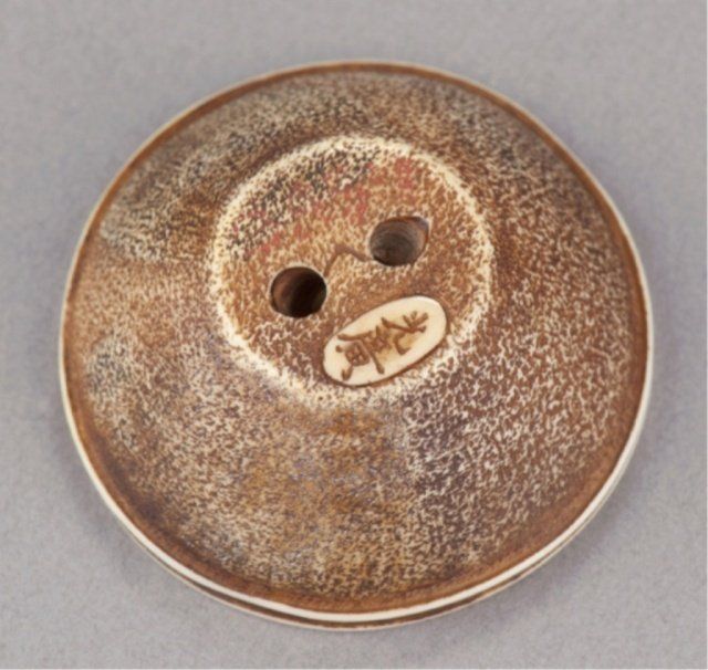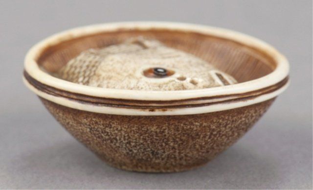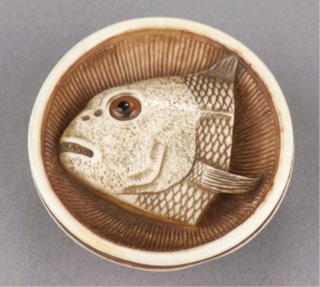 By Ohara Mitsuhiro (b.1810), Osaka, , Mid 19th century. The head of a sea bream in a mortar. Signed on bottom in oval reserve, Mitsuhiro. Similar example illustrated in Lazarnick, pg.1322 with kakihan added to signature. Ex Richards collection. 1 1/2in (3.8cm). Provenance: Ex Richards collection. Purchased from R. Koscherak, 1957.