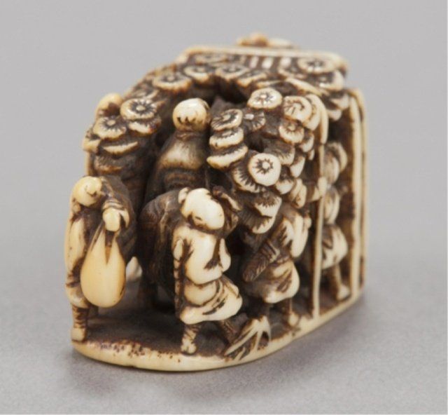 By Ryusa Gyokugasai, Tokyo, Mid 19th century. , Mid 19th century. Riding through an avenue of pine trees towards a gate while six other travelers stand by, one opening the gate. Signed on the base, Ryusa, with kakihan. The face of the spear holder on one side is chipped off. 1 5/8in (4.1cm). Provenance: Sotheby's, London, July 30, 1968; Lot 437.