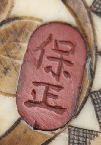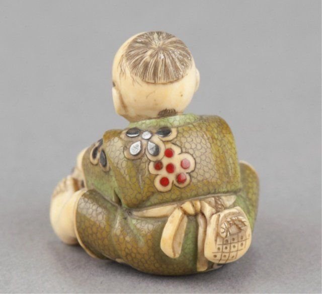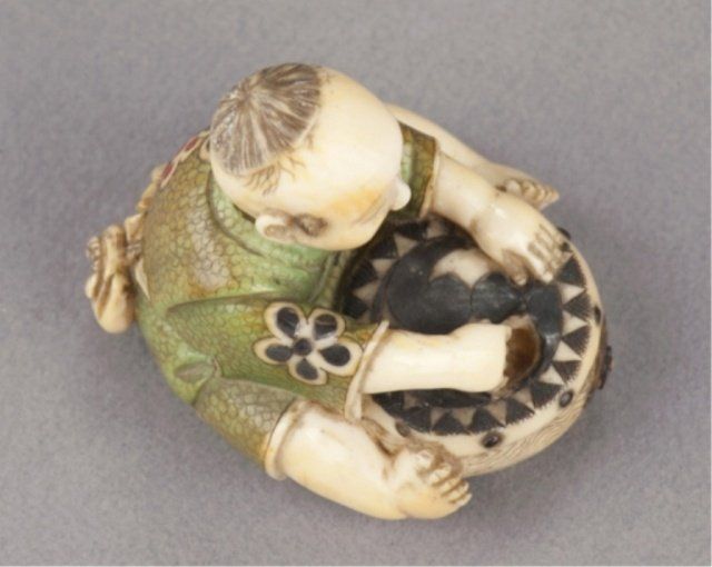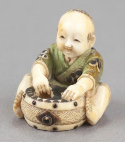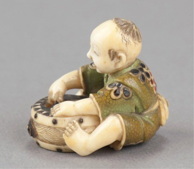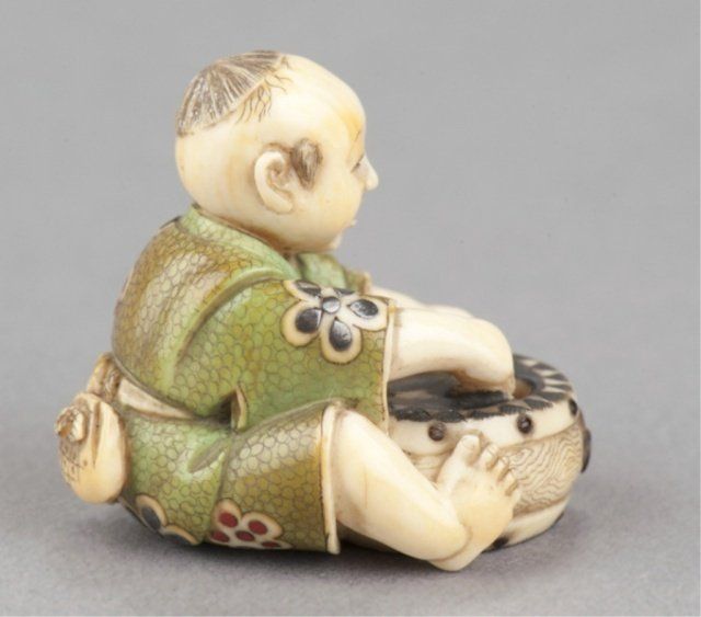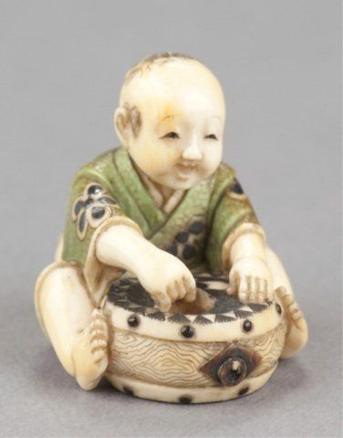 Yasumasa [Hosei] (D0720), Tokyo, Early 20th century. Tearing open the top of a drum that sits in front of him, his face has a huge smile as he revels in his accomplishment, his right hand has inserted itself into the hole, a kinchaku hangs from the back of his obi, his yukata is stained green and covered with mon designs of stylized plum blossoms that have been inlaid with tsuishu and horn dots, and the drum is inlaid with horn and tortoise-shell. Signed on underside of drum in an inlaid tsuishu tablet, Yasumasa. Meinertzhagen and Davey both list this artist as Hosei while Lazarnick lists him as Yasumasa and mentions that he was probably a pupil of Yasuaki. 1 1/4in (3cm). Provenance: Purchased from Joseph U. Seo, 1960. Illustrated in the Netsuke Kenkyukai article on the Mang Collection (Vol. 3, No. 4 - December 1983) Exhibited: the Student Center (August 29 - September 25, 1960)
