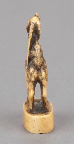 Late 18th century. Standing with head raised on a seal base, the single slender horn reaches down to his back and parallels his long bushy tail that reaches up to his neck, flames reach back from the top of the legs and hair is shown as rosettes that appear across the body. The base bears a two-character sealthat is heavily impregnated with red ink. Unsigned 2in (5cm).