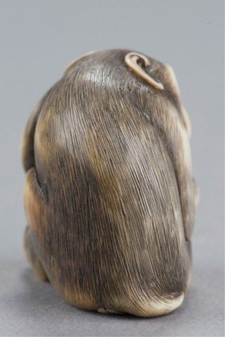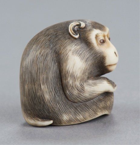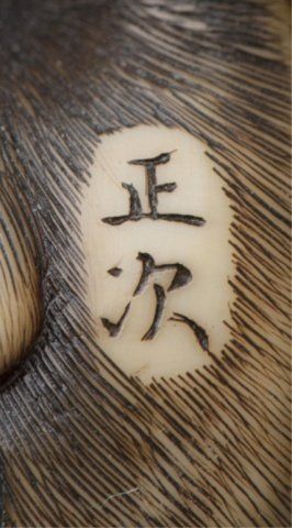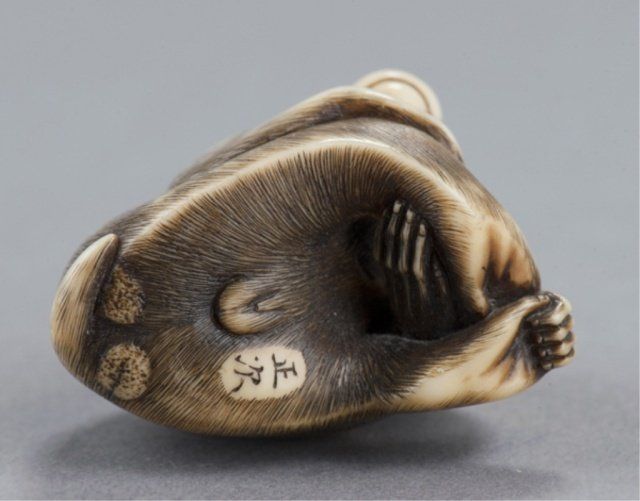 By Masatsugu, Osaka, , Early/mid 19th century. Seated with his legs folded in front and his arms tucked inside the folded legs, eyes double-inlaid in dark horn or amber. Dense, well-carved hair-work that has been stained black covers the body. The himotoshi use natural openings. Signed on the underside in a polished oval reserve, Masatsugu. An early work by Kaigyokusai who stopped using the go of Masatsugu in 1835. 1 1/4in (3.3cm).