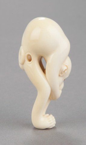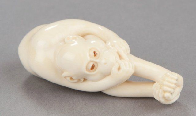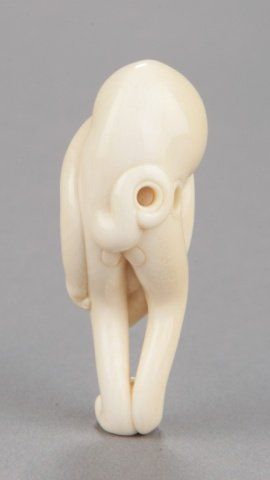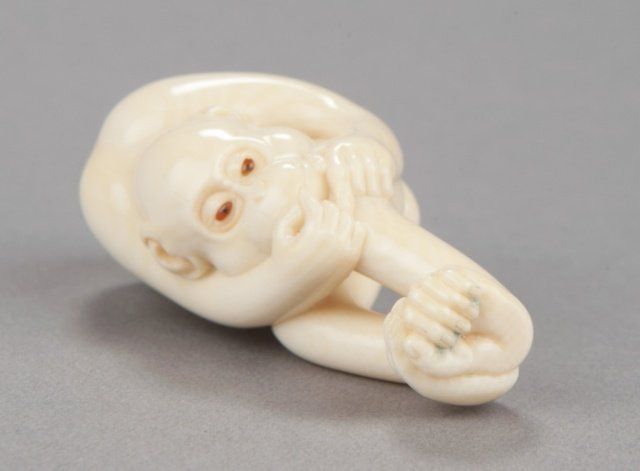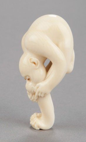 By Kangyoku Risshisai, Tokyo, Mid 20th century. One of his humorous studies of a monkey, standing but leaning forward, bent at the waist, and intently engaged in picking something from his teeth. The fine quality ivory is polished and without hair-work, and the eyes are double-inlaid in horn. Signed without reserve, Risshisai, and in an oval reserve, Kangyoku. 2 3/4in (6.9cm).