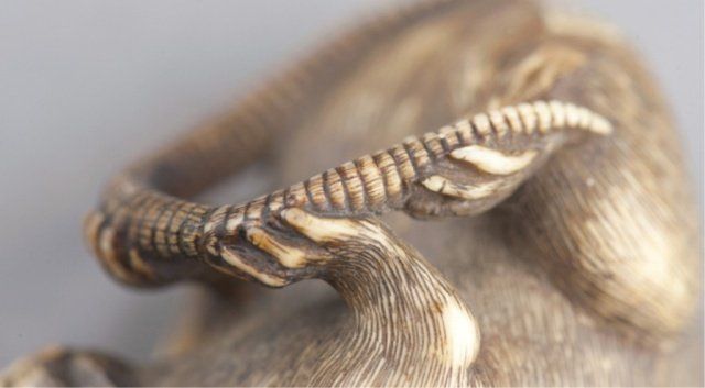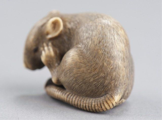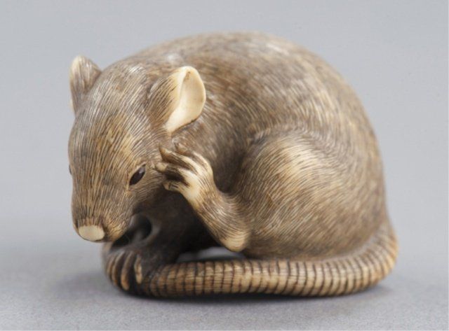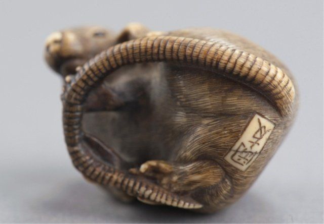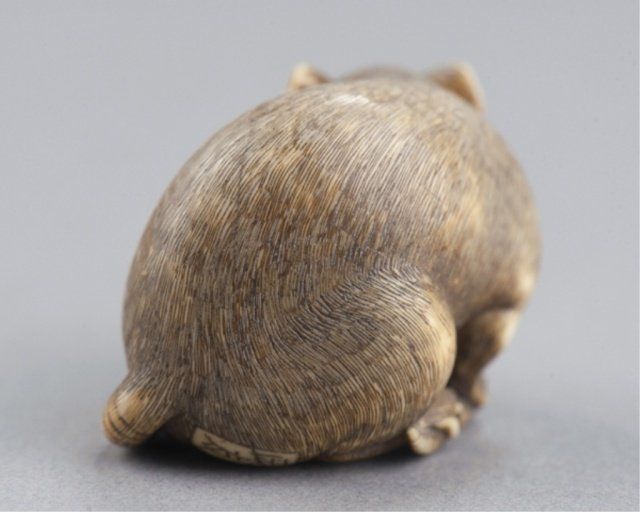 By Yamaguchi Okatomo, Kyoto, , Late 18th century. Sitting on its tail and scratching face with the left paw. Eyes inlaid in dark horn. Signed on underside in rectangular reserve, Okatomo. 1in (2.6cm). Provenance: Ex collection of Wolf Ladejinsky, who was on MacArthur's SCAP staff in Japan at the end of the war and was influential in restoring Japan's agricultural programs.