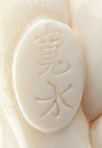 By Kansui, Tokyo, Mid 20th century. Eyes are double-inlaid in horn with black pupils, highly polished. Signed on the underside in a raised oval tablet, Kansui. 1 3/4in (4.3cm).