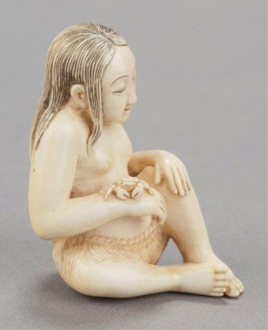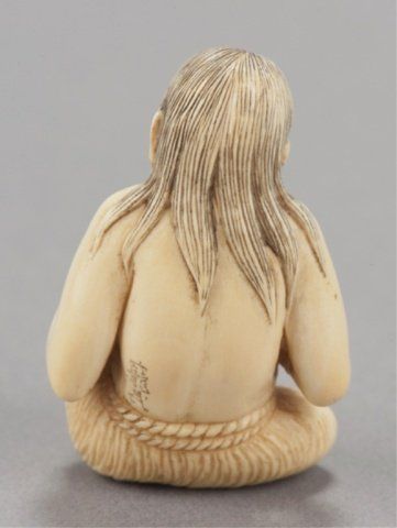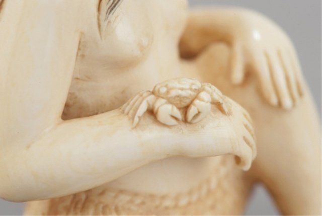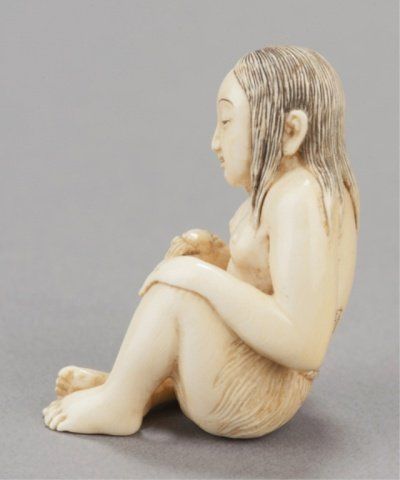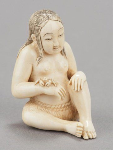 Chomin, Tokyo, Late 19th century. Seated in her grass skirt sitting with a slight smile on her face looking at a crab that sits on her right wrist, her hair reinforced with black ink and a slight touch of red on her mouth. Signed on her lower back, Chomin. 1 3/4in (4.5cm). Provenance: Purchased from Joseph U. Seo, 1958.