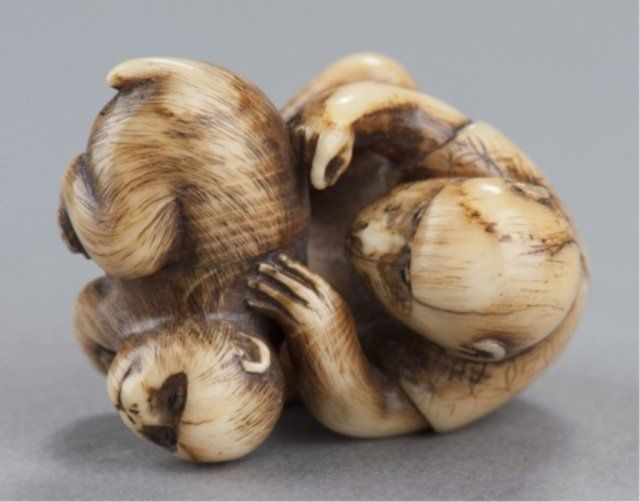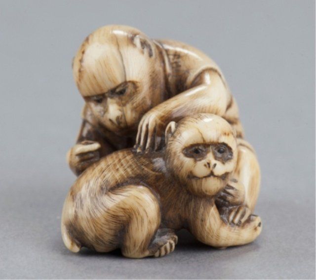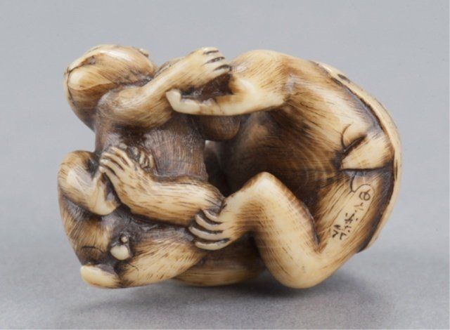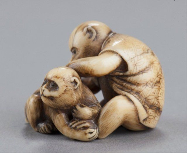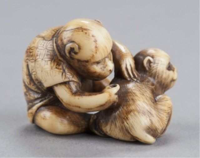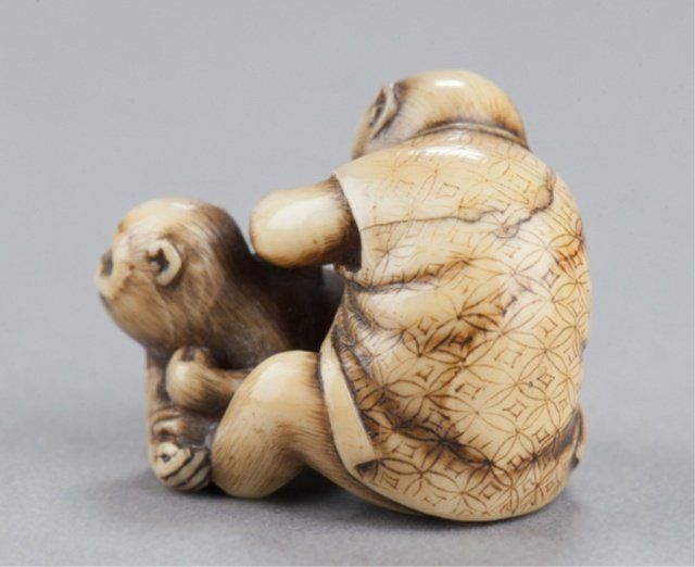 School of Nagai Rantei, Kyoto, , Mid 19th century. Larger monkey wearing a short tunic with a diapered lozenge pattern and picking fleas of the back of the smaller one, eyes of both inlaid in black horn. Lightly stained and worn with some patination and a few age cracks appearing. Signed on the underside in a polished oval reserve, Rantei. 1 1/8in (2.9cm).