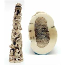 An ivory okimono, Meiji, team of figures passing coconuts from palm tree, signed, 5.5ins £70-100