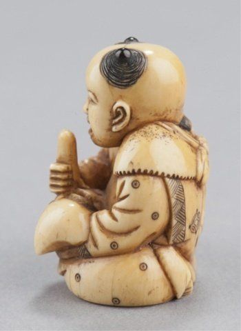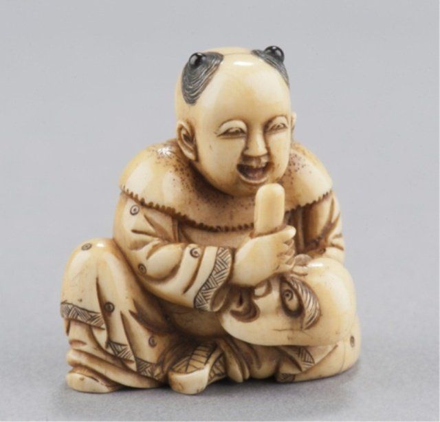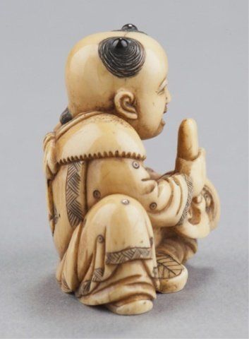 Tokyo, Mid 19th century. , Mid 19th century. Affectionately grasping the nose of a Tengu mask. The hems of his robe, the hair surrounding his top knots, and the signature on the bottom are all reinforced with black ink while his topknots themselves are inlaid in black horn. Inscribed without reserve, Tomochika. 1 3/8in (3.6cm). Provenance: Purchased from R. Koscherak, 1951.