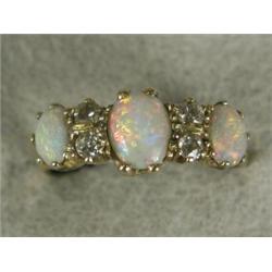 An opal and diamond engraved 1/2 hoop ring set with three cabochon opals and four old cut diamonds, size P 1/2 Est. 150/250