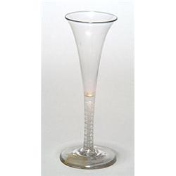 An opaque-twist wine flute, of drawn trumpet form on a double series stem and conical foot, 19cm high, circa 1770