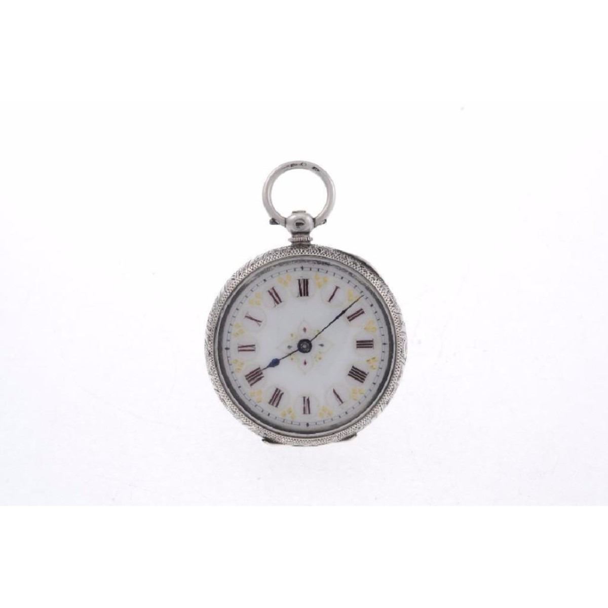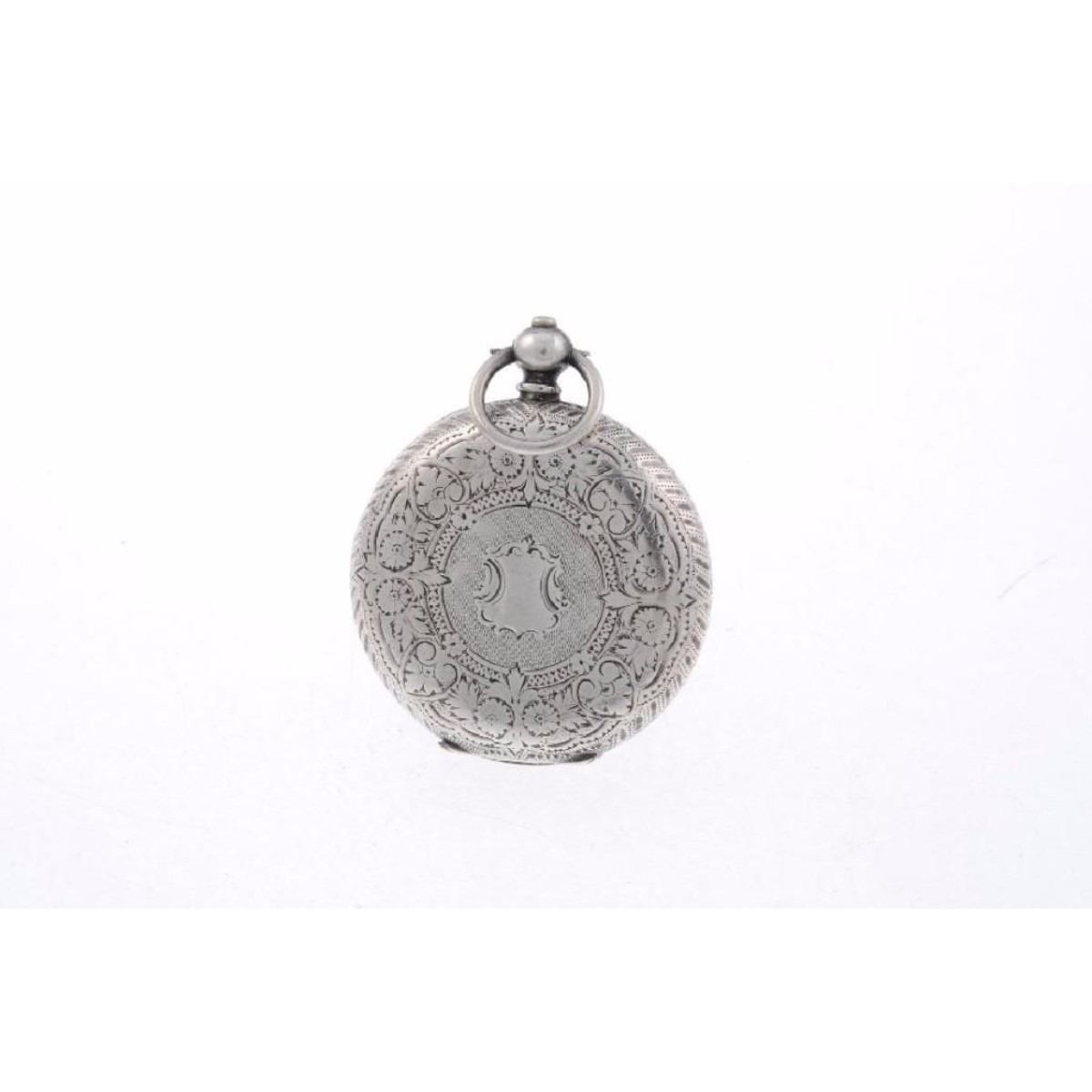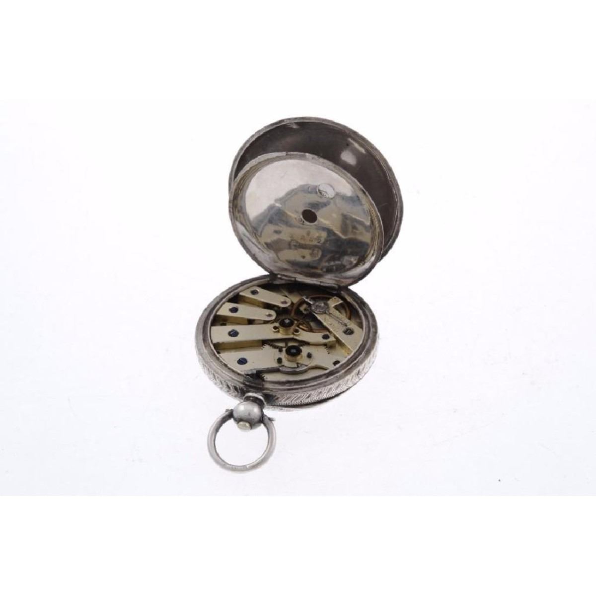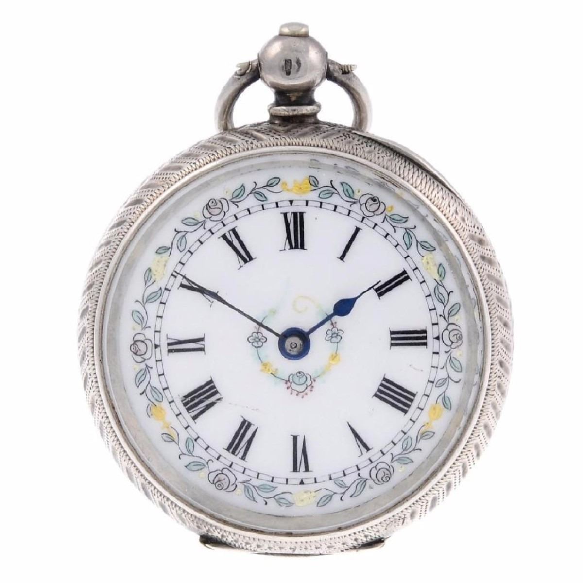 An open face pocket watch. White metal case, stamped 0,935 with poincon. Unsigned Swiss bar movement with cylinder escapement. White dial. 38mm. Together with another white metal pocket watch.CONDITION Movement is not currently functioning. Movement has scratches, marks and tarnishing commensurate with general wear visible to the naked eye. Dial appears to be in an average condition with some light marks and scratches when viewed under a 4x loupe. Hands show noticeable marks and tarnishing. Glass has scratches and marks. Case shows scratches, marks and dints. Hinges appear intact. The other watch in this lot does not appear to be functioning.
