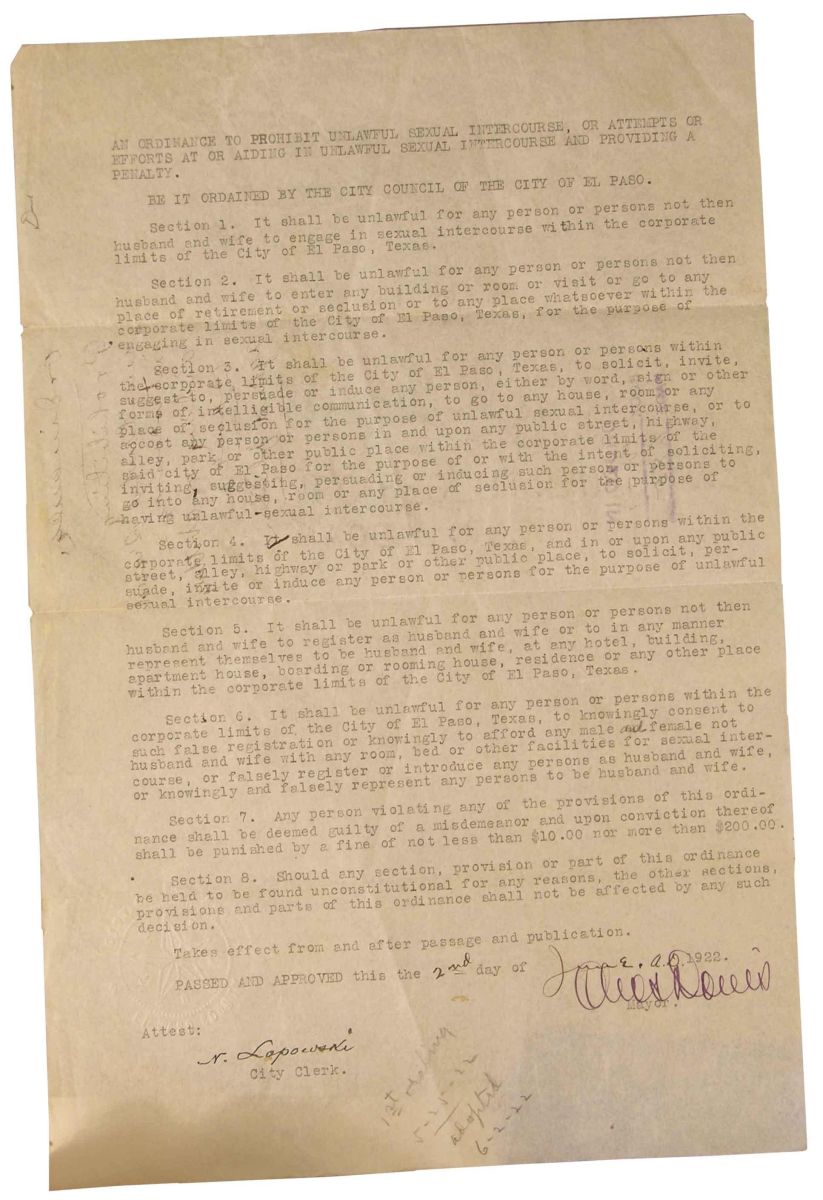 An ordinance to prohibit unlawful sexual intercourse or attempts or efforts at or aiding in unlawful sexual intercourse and providing a penalty. Be it ordained by the city council by the city of El Paso. Signed by the Mayor on the 2nd day of June, 1922. Excellent condition. 8 1/2 X 13 inches.