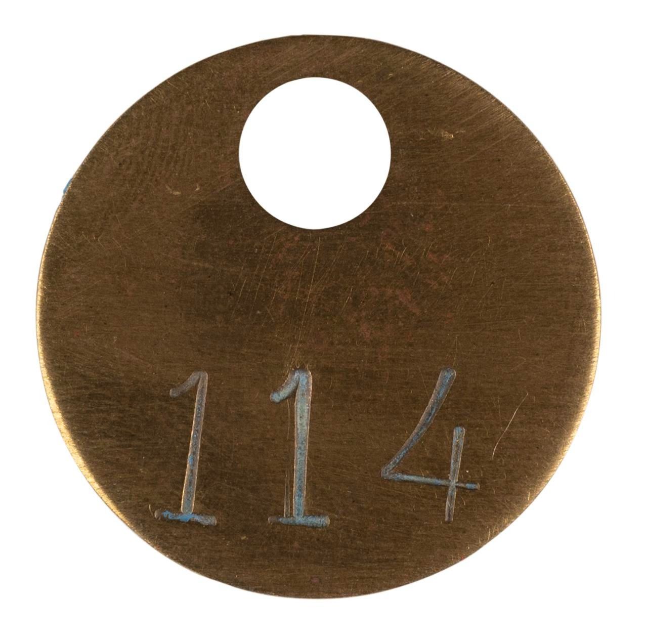 (Disneyland, 1960s-70s) An original brass tag for a Disneyland locker numbered 114. Measuring 1" in diameter, the tag is in very good condition with wear from Park use.